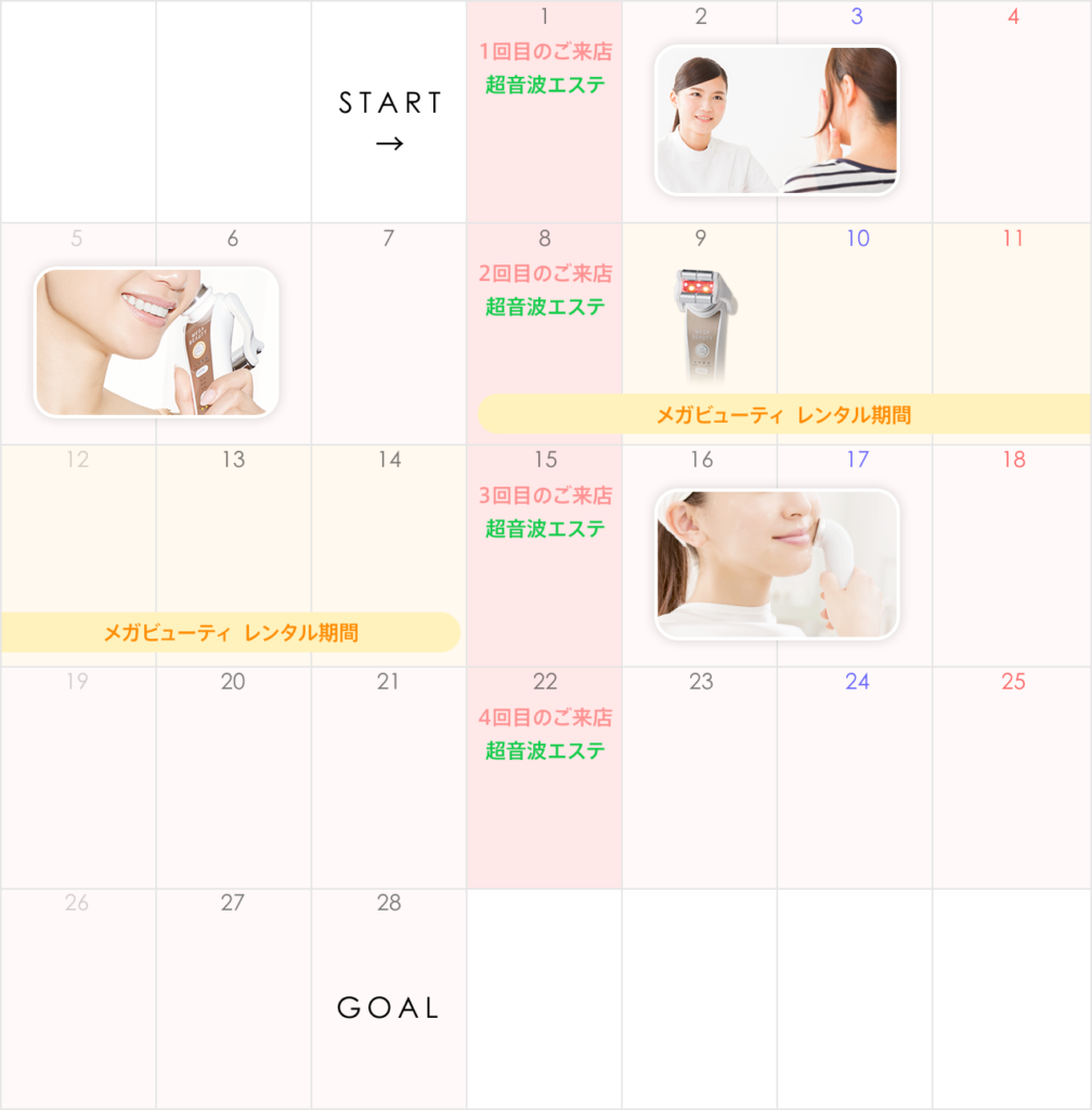 モニター期間終了後に、簡単なアンケートにご協力いただきます週に1回のペースで4回のエステをしていただきます。ご希望の日程をあらかじめお伝えください。